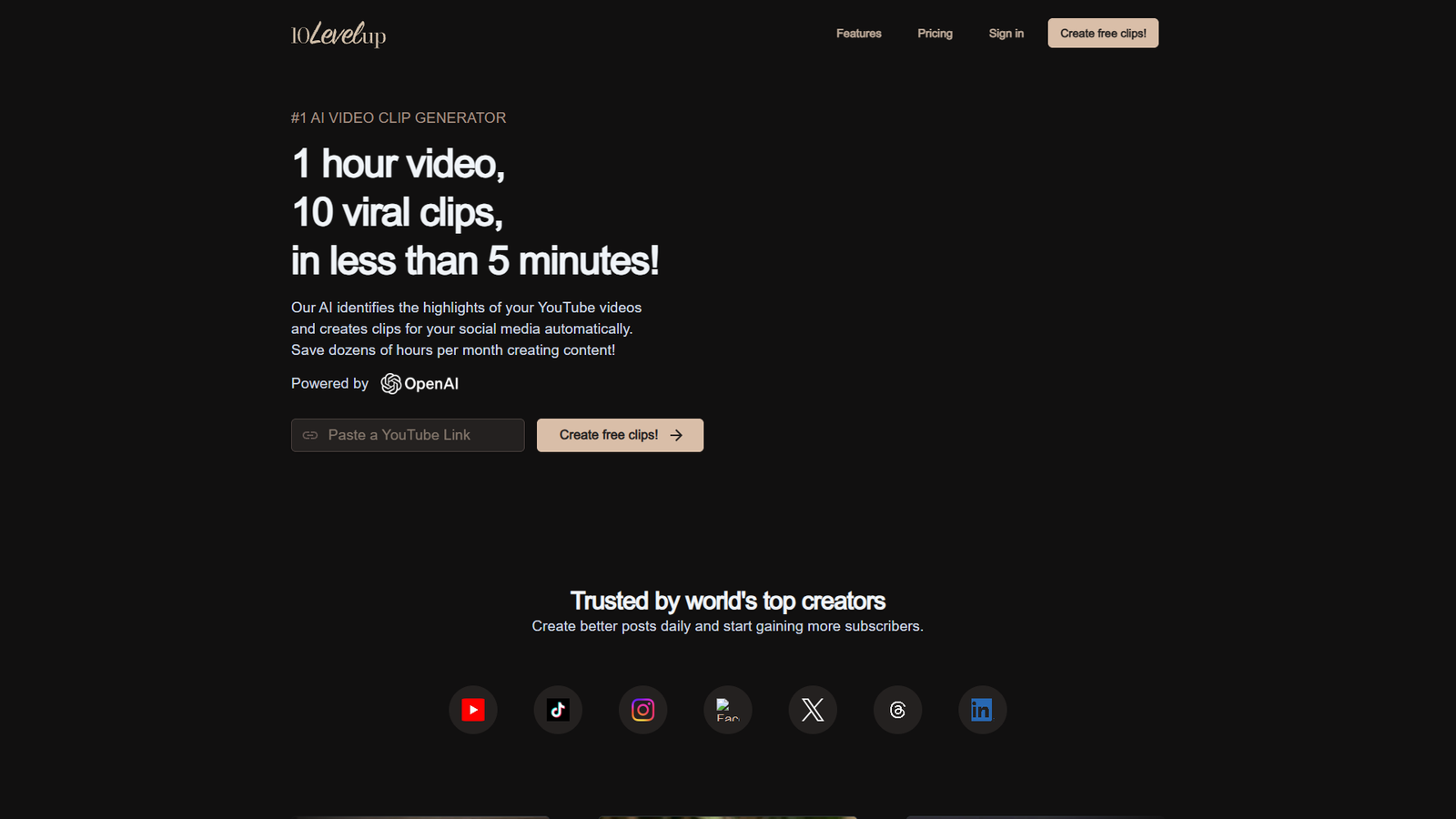 10LevelUp — это ИИ-сервис для автоматического создания коротких вирусных клипов из длинных видео, в первую очередь с YouTube. Платформа находит самые яркие и вовлекающие моменты и превращает их в готовые ролики для соцсетей за считанные минуты.