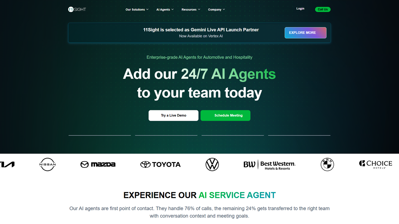 11Sight — это AI-агент для автодилеров и компаний в сфере гостеприимства, который берет на себя первичное общение с клиентами и запись на сервис. Система работает 24/7 и оформляет заявки на обслуживание автомобиля менее чем за 90 секунд, снижая нагрузку на колл-центр и администраторов.
