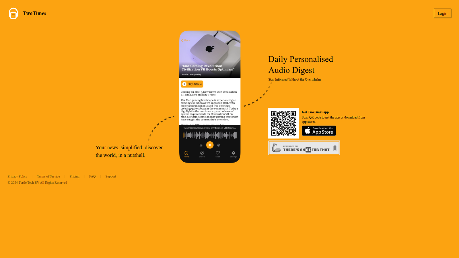 TwoTimes собирает новости дня и превращает их в короткий персонализированный аудиодайджест. Пользователь получает сжатую картину мира в удобном формате, без бесконечной ленты и лишнего шума.