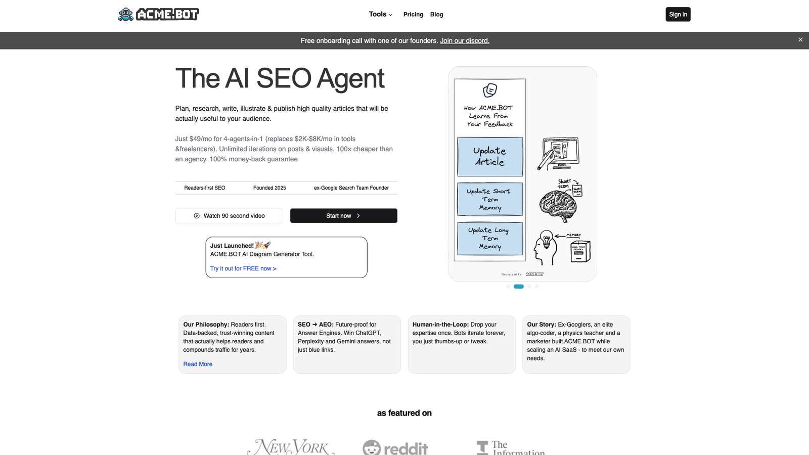 ACME.BOT — это ИИ-агент для SEO, который закрывает сразу несколько задач контент-маркетинга: от подбора ключевых слов до публикации готовых материалов и схем.