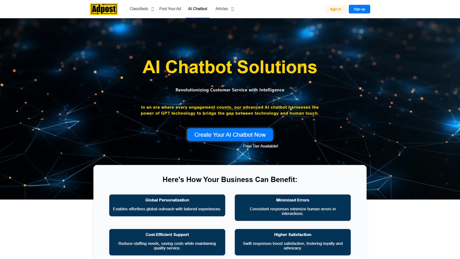 Adpost AI Chatbot — это решение на базе GPT-технологий, созданное для автоматизации и усиления клиентской поддержки в цифровых каналах. Сервис помогает компаниям любого масштаба быстро развернуть умного чат-бота, который понимает запросы пользователей и отвечает максимально близко к живому оператору.