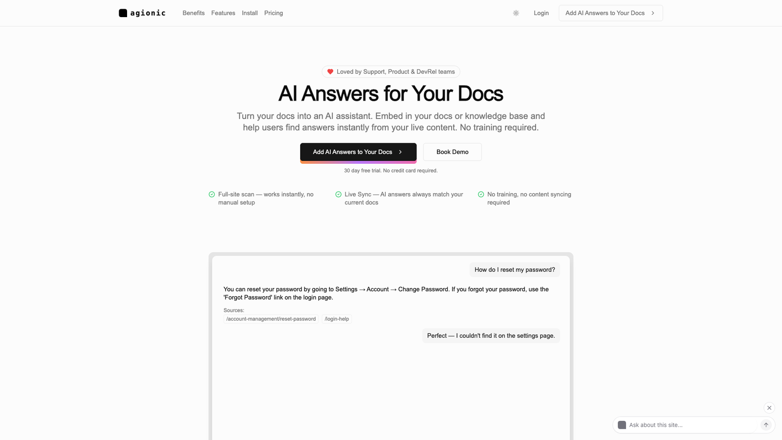 Agionic превращает документацию и базу знаний в встроенного ИИ-помощника. Пользователь задаёт вопрос прямо на странице, а ответы формируются из актуального содержимого сайта — без ручной подготовки датасетов.
