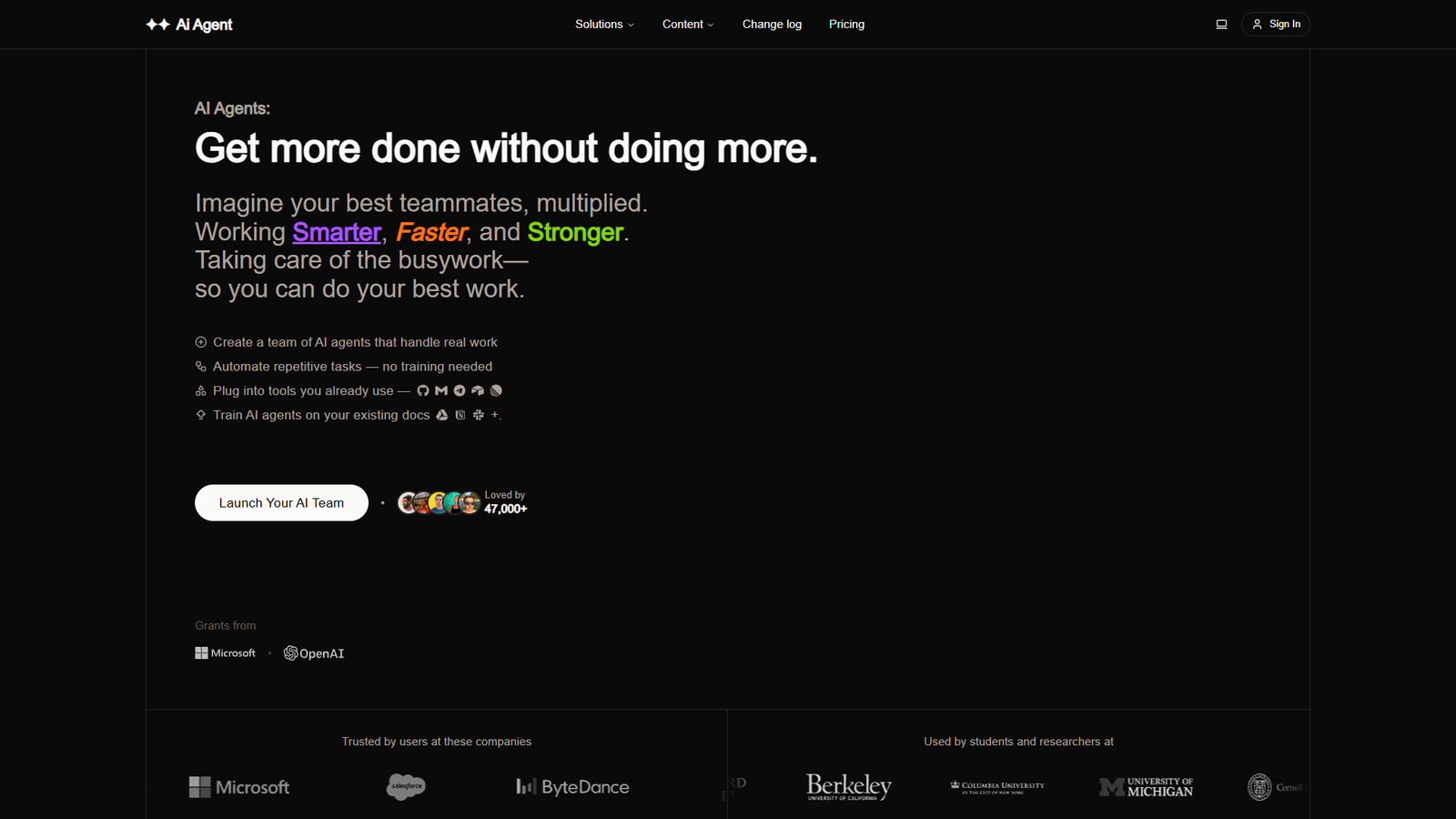AI Agent подходит для компаний, команд, студентов и исследователей, которым важно ускорить рабочие процессы и минимизировать ручной труд. Более 47 000 пользователей уже используют платформу, чтобы выстроить собственную экосистему AI-агентов и масштабировать продуктивность без роста штата.