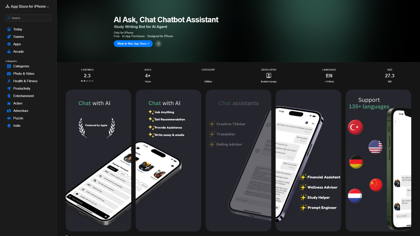 Сервис работает как универсальный виртуальный помощник: составление текстов, генерация ответов, подсказки по задачам и планам. Всё это доступно в одном приложении, оптимизированном под iPhone, с поддержкой нескольких языков и встроенными покупками для расширенных возможностей.