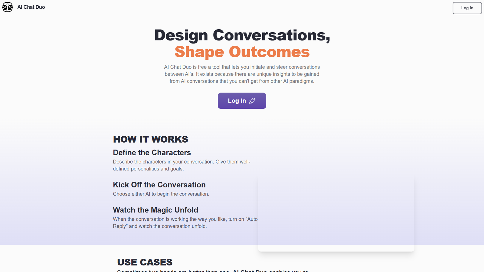 AI Chat Duo — это онлайн-инструмент, который позволяет запускать и направлять диалоги между двумя ИИ. Вместо привычного формата «человек — нейросеть» вы наблюдаете, как два разных AI-персонажа спорят, соглашаются, уточняют и дополняют друг друга.