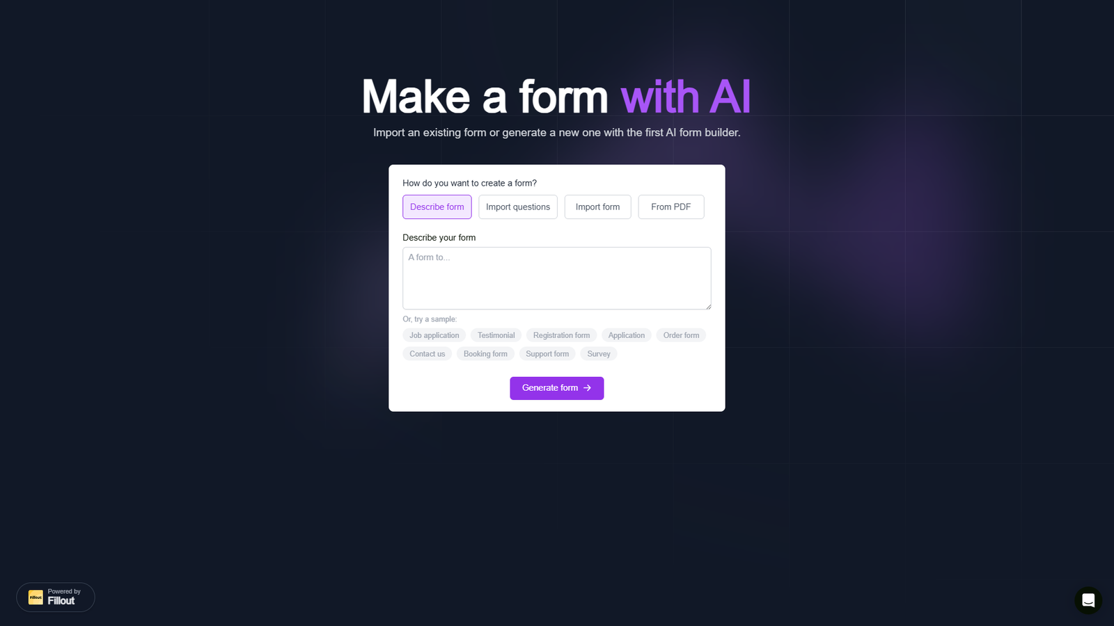 AI Form Generator — это онлайн-конструктор форм, который использует ИИ для мгновенного создания опросов, анкет, квизов и регистрационных форм. Вместо ручного набора десятков вопросов вы просто описываете нужную форму, а система сама генерирует структуру и формулировки.