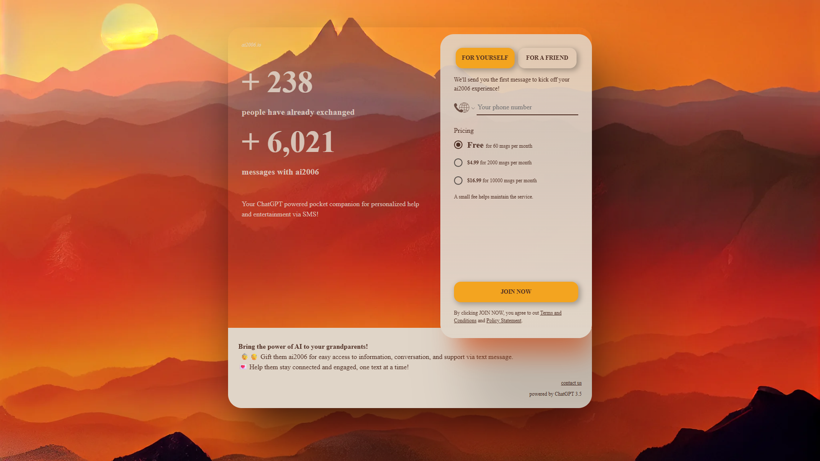 ai2006 — это карманный AI-ассистент на базе ChatGPT, который всегда под рукой в формате обычных SMS-сообщений. Вам не нужно устанавливать приложения, заходить в браузер или разбираться в сложных настройках: просто переписывайтесь с ИИ так же, как с любым другом.