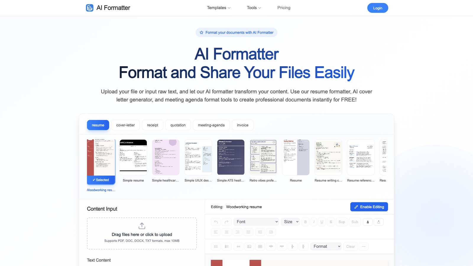 AI Formatter автоматизирует оформление текстовых документов: от резюме и сопроводительных писем до счетов и рабочих повесток. Пользователь загружает файл или вставляет сырой текст, выбирает подходящий шаблон и получает аккуратно структурированный документ.