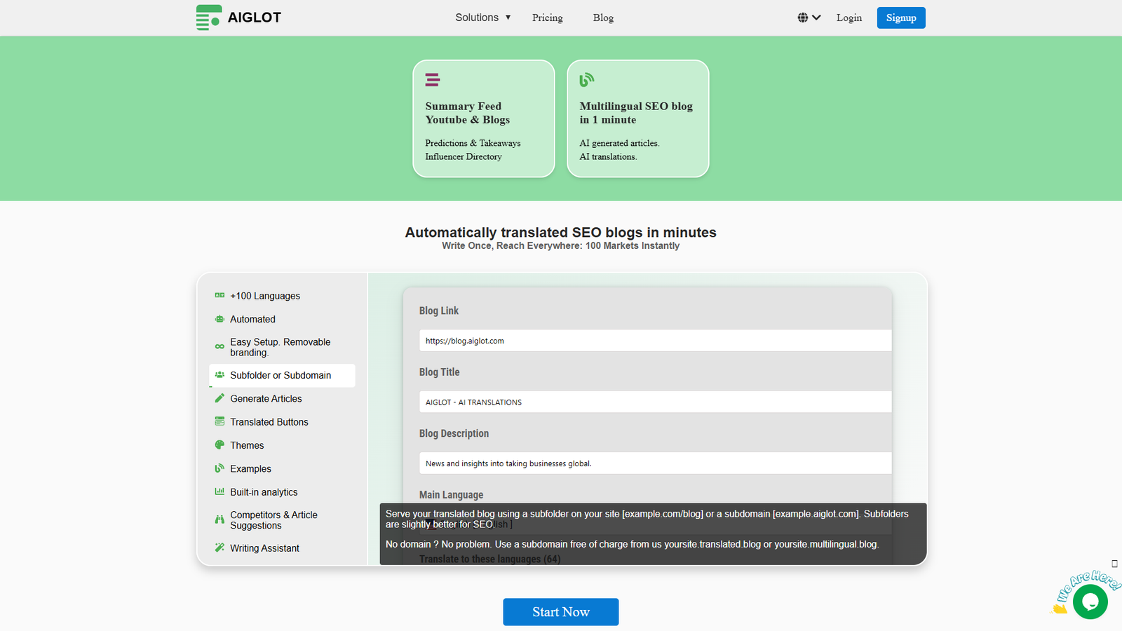 Через AIGLOT можно создать отдельный блог или подключить его к существующему сайту. Переведенный контент размещается в подкаталоге (например, example.com/blog) или на поддомене. Поддерживается более 100 языков, что упрощает выход в новые страны без ручного перевода.