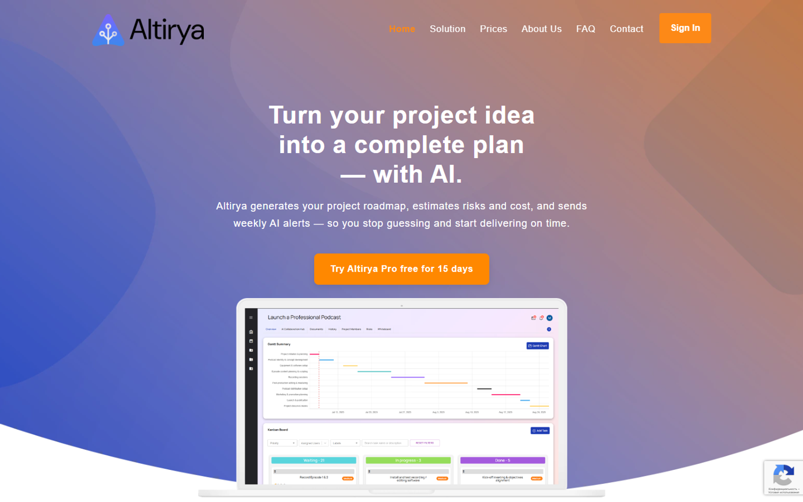 Altirya — это AI-инструмент для руководителей проектов, продуктовых команд и фаундеров, которым важно быстро превратить идею в структурированный план. Сервис помогает разложить инициативу на этапы, задачи и зависимости, а затем следить за исполнением без ручного микроменеджмента.