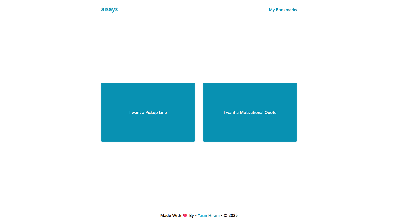 Интерфейс минималистичен: всего несколько кнопок и возможность сохранять понравившиеся фразы в закладки (My Bookmarks). Это делает aisays удобным помощником для быстрых идей, когда нужно «что-то сказать», но ничего не приходит в голову.