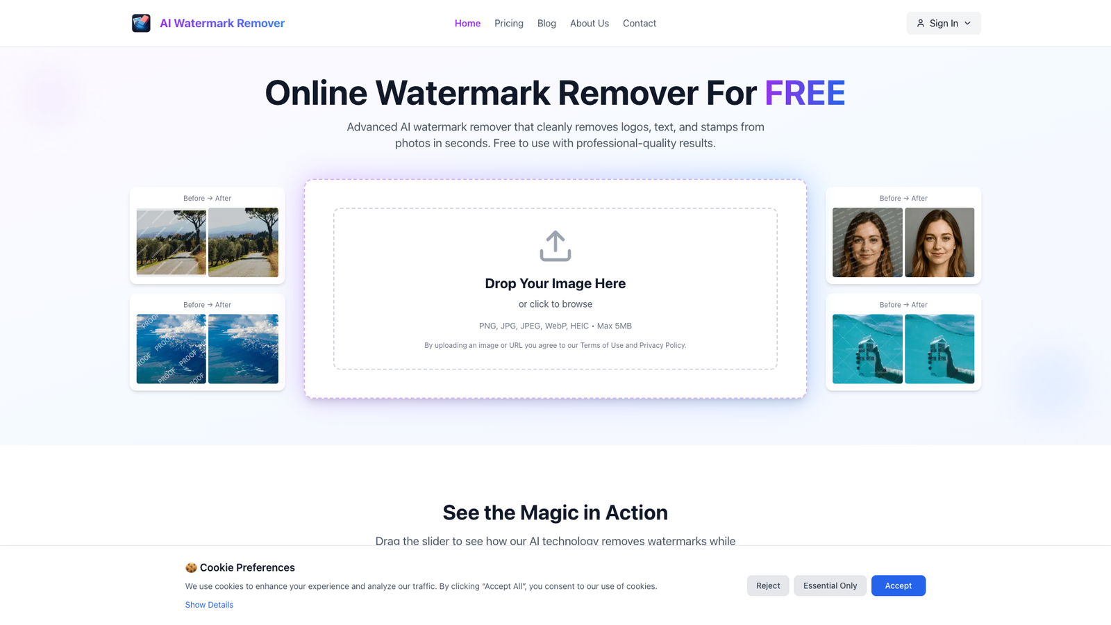 AI Watermark Remover удаляет водяные знаки с изображений прямо в браузере. Достаточно перетащить файл или выбрать его с диска, и нейросеть автоматически обработает фото за несколько секунд.