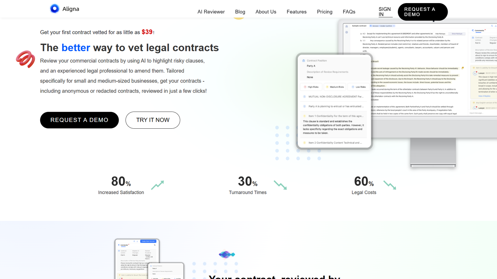 Aligna — это сервис для быстрой и безопасной проверки коммерческих контрактов, который сочетает ИИ и экспертизу профессиональных юристов. Платформа помогает малому и среднему бизнесу выявлять риски в договорах и получать правки от практикующих специалистов всего за несколько кликов.