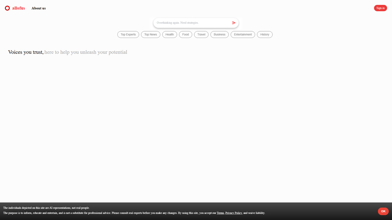 AllOfUs AI — это платформа, которая объединяет ведущих экспертов и новости из разных сфер, чтобы помочь вам раскрыть свой потенциал. Сервис фокусируется на темах здоровья, питания, путешествий, бизнеса, развлечений и истории, предлагая доступ к проверенным мнениям и аналитике.