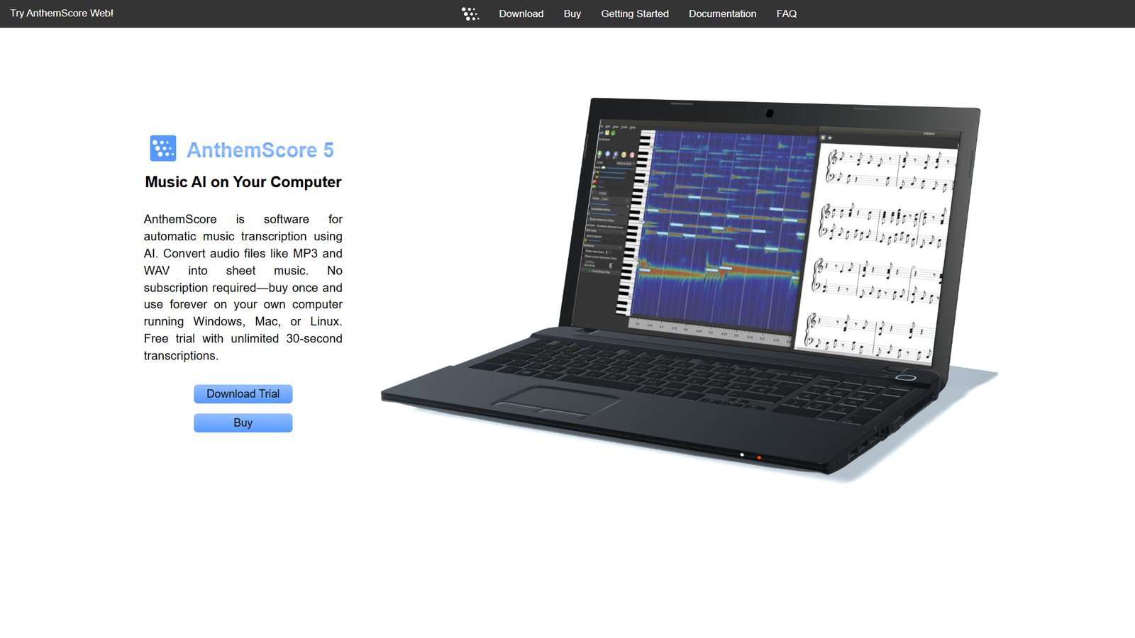 AnthemScore работает на вашем компьютере (Windows, macOS, Linux) и не требует подписки: покупка один раз — использование без ограничений по времени. Доступна бесплатная пробная версия с неограниченным количеством транскрипций длительностью до 30 секунд.