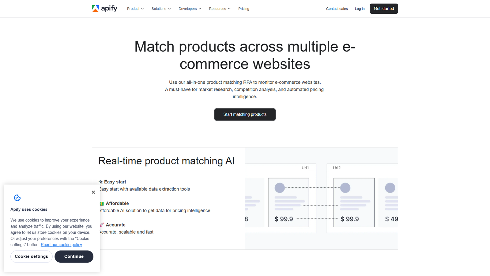 Apify Product Matching AI масштабируется от 1 000 до 1 000 000+ пар товаров и интегрируется через готовые инструменты извлечения данных Apify. Это делает запуск быстрым и относительно недорогим по сравнению с разработкой собственной системы веб-скрейпинга и сопоставления товаров.