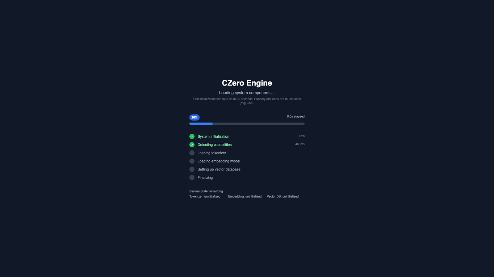 Ядро CZero Engine берет на себя инициализацию ключевых компонентов: токенизатора, модели встраиваний и векторной базы. На экране видно пошаговую загрузку: обнаружение возможностей, настройка хранилища векторов, подготовка к диалогу. После первой инициализации последующие запуски занимают считанные секунды.