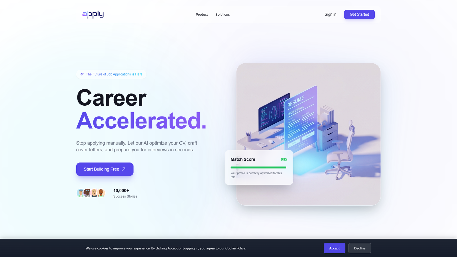 Apply AI — это платформа с набором ИИ-инструментов, которая ускоряет и упрощает весь процесс отклика на вакансии: от создания резюме до подготовки к собеседованию.