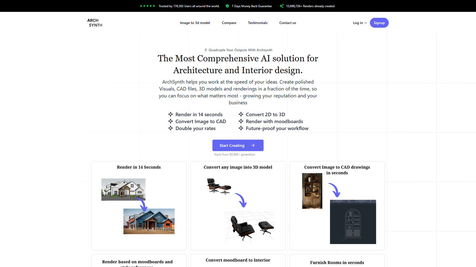 Платформа уже используется сотнями тысяч пользователей по всему миру и позволяет создавать миллионы рендеров с минимальными трудозатратами. Быстрая генерация (около 14 секунд), удобный онлайн-интерфейс и фокус на архитектуре делают Archsynth мощным инструментом для роста репутации и бизнеса.