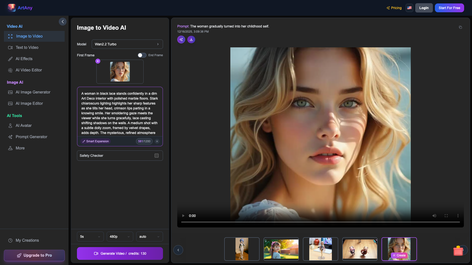 ArtAny Image to Video AI превращает статичные изображения в короткие анимированные ролики за один клик. Достаточно загрузить картинку, задать текстовый промт и дождаться, пока нейросеть создаст плавное движение, переходы и анимацию.