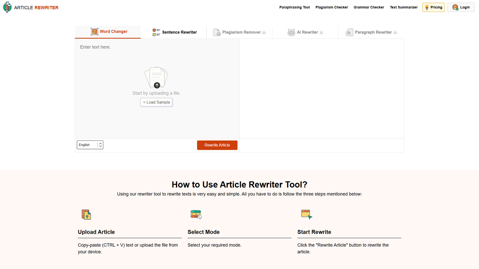 Использование сервиса максимально простое: вставьте текст или загрузите файл, выберите нужный режим и нажмите кнопку «Rewrite Article». Бесплатная версия обрабатывает первые 1500 слов, чего достаточно для большинства статей, эссе и постов.