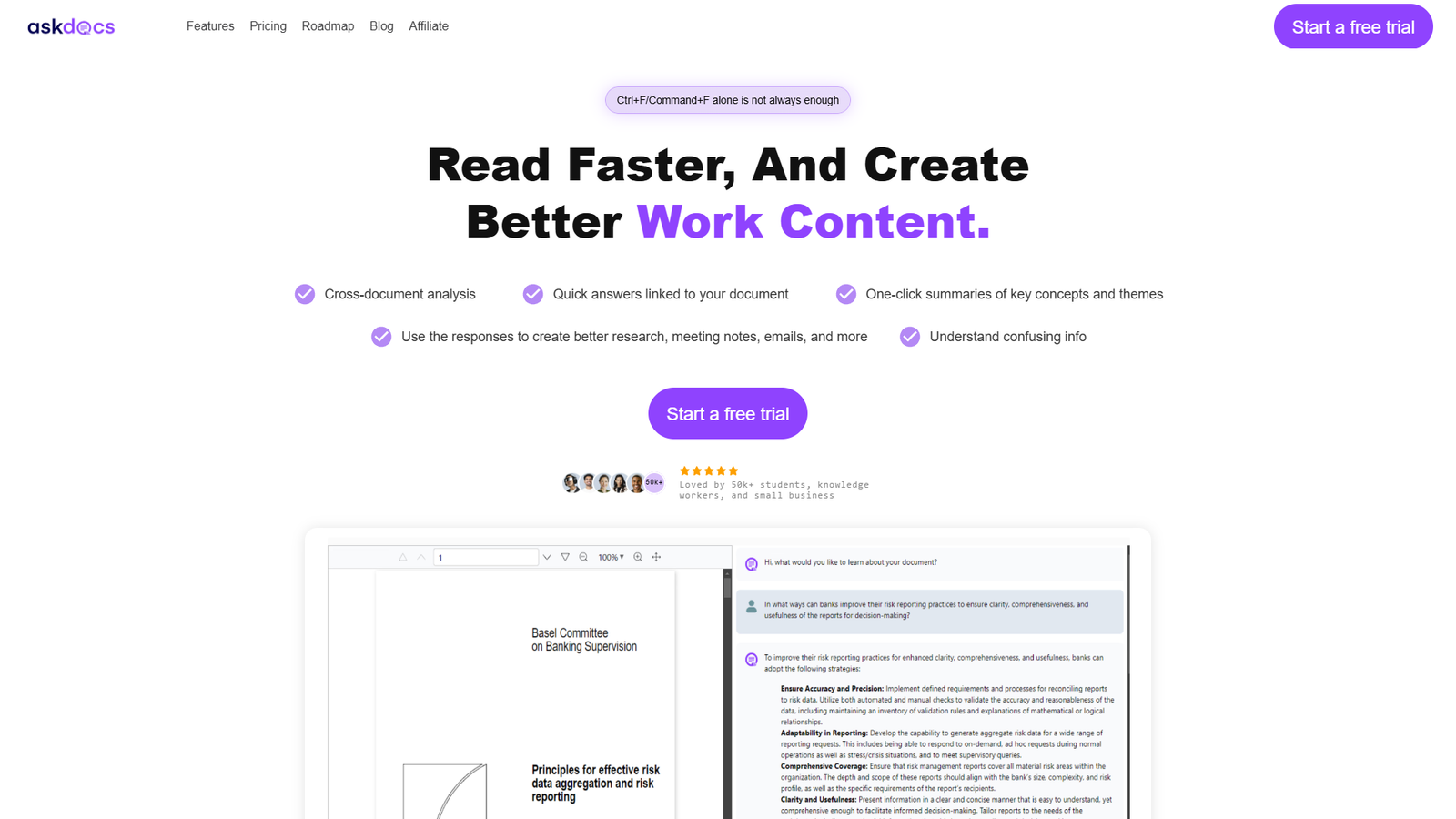 Платформой пользуются десятки тысяч студентов, исследователей, специалистов и малых бизнесов. AskDocs помогает разбираться в сложной информации, экономить время на чтении и фокусироваться на выводах и принятии решений.