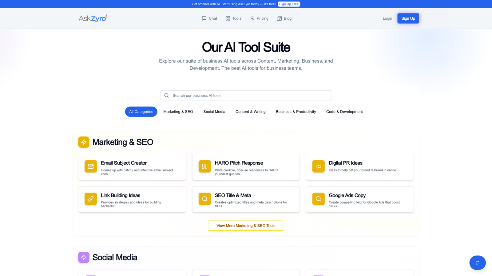 AskZyro объединяет набор специализированных AI-инструментов для повседневных задач бизнеса. В одном интерфейсе собираются решения для контента, маркетинга, продуктивности и разработки, чтобы команды не переключались между десятком разрозненных сервисов.