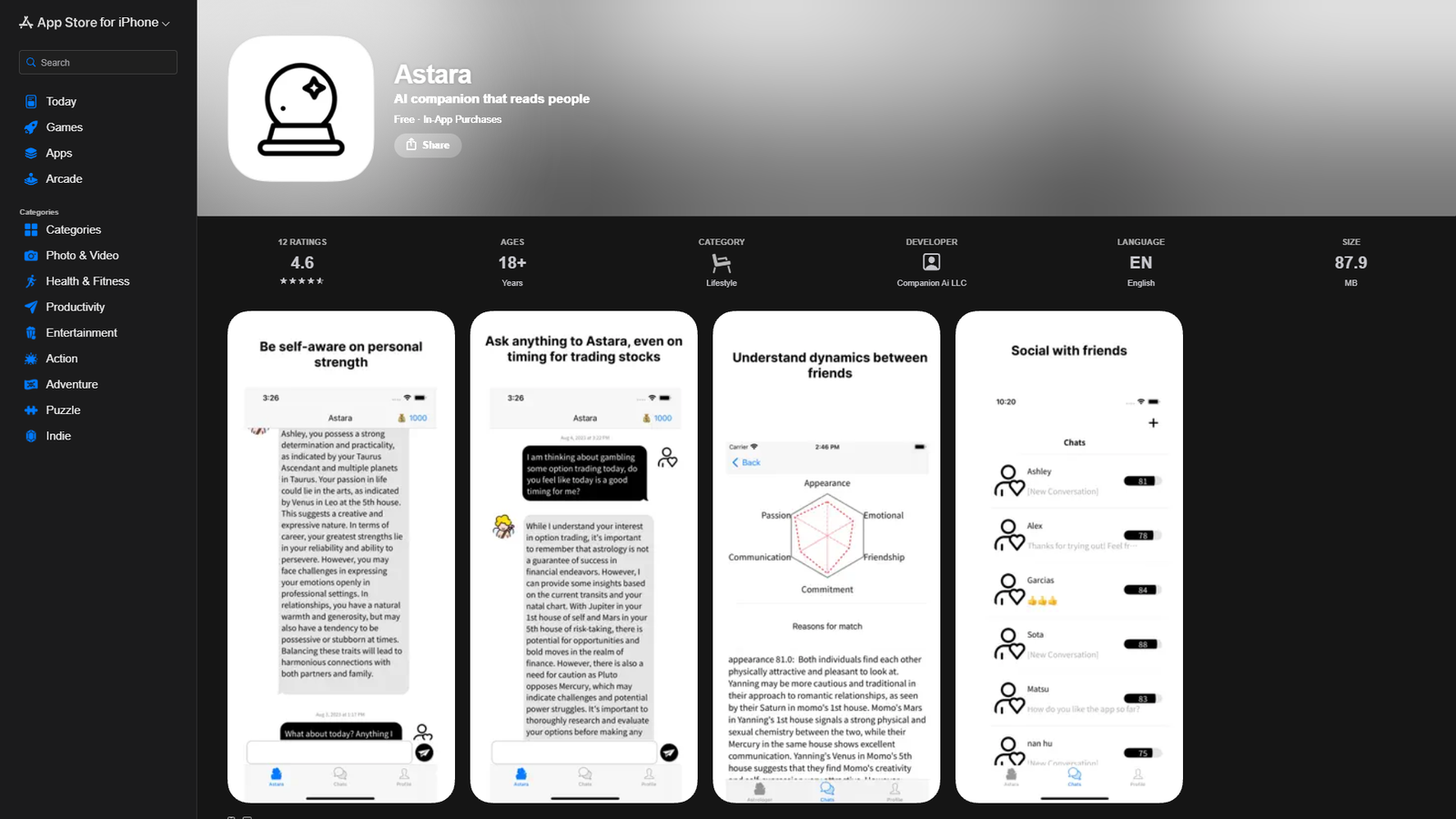 Приложение рассчитано на пользователей 18+, доступно на iPhone и iPad и относится к категории Lifestyle. Astara может стать вашим постоянным цифровым спутником, к которому легко обратиться в любой момент, когда нужна поддержка, совет или просто кто-то, кто внимательно «выслушает».