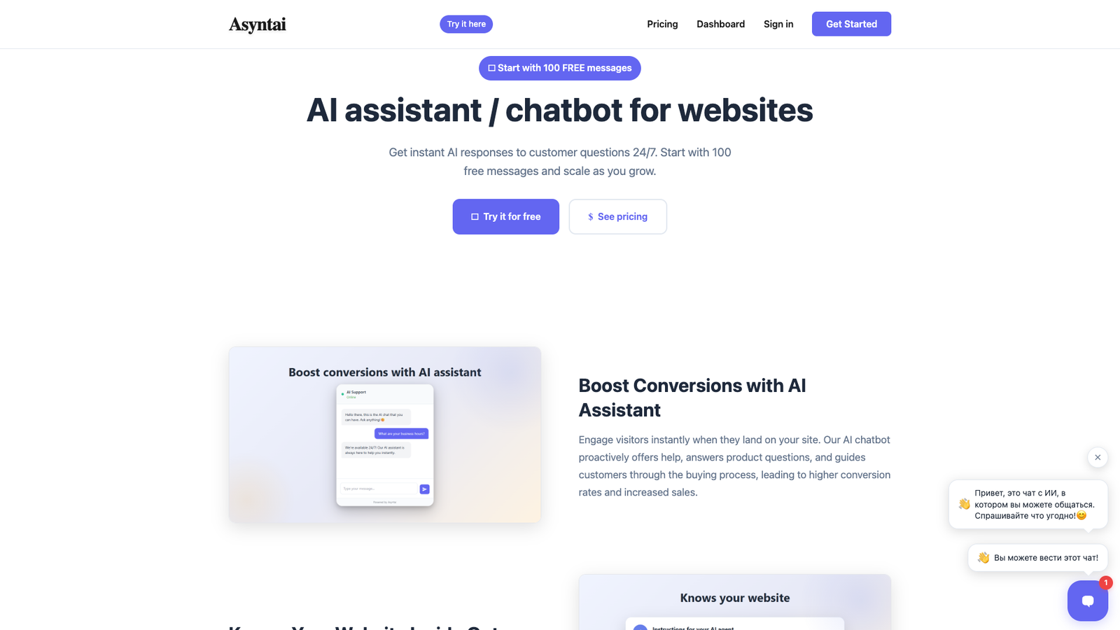 Asyntai — это AI-ассистент и чат-бот для сайтов, который отвечает на вопросы посетителей круглосуточно и без очередей. Он подключается к вашему ресурсу, изучает контент страниц и загруженные документы, а затем использует эти данные для точных и контекстных ответов.