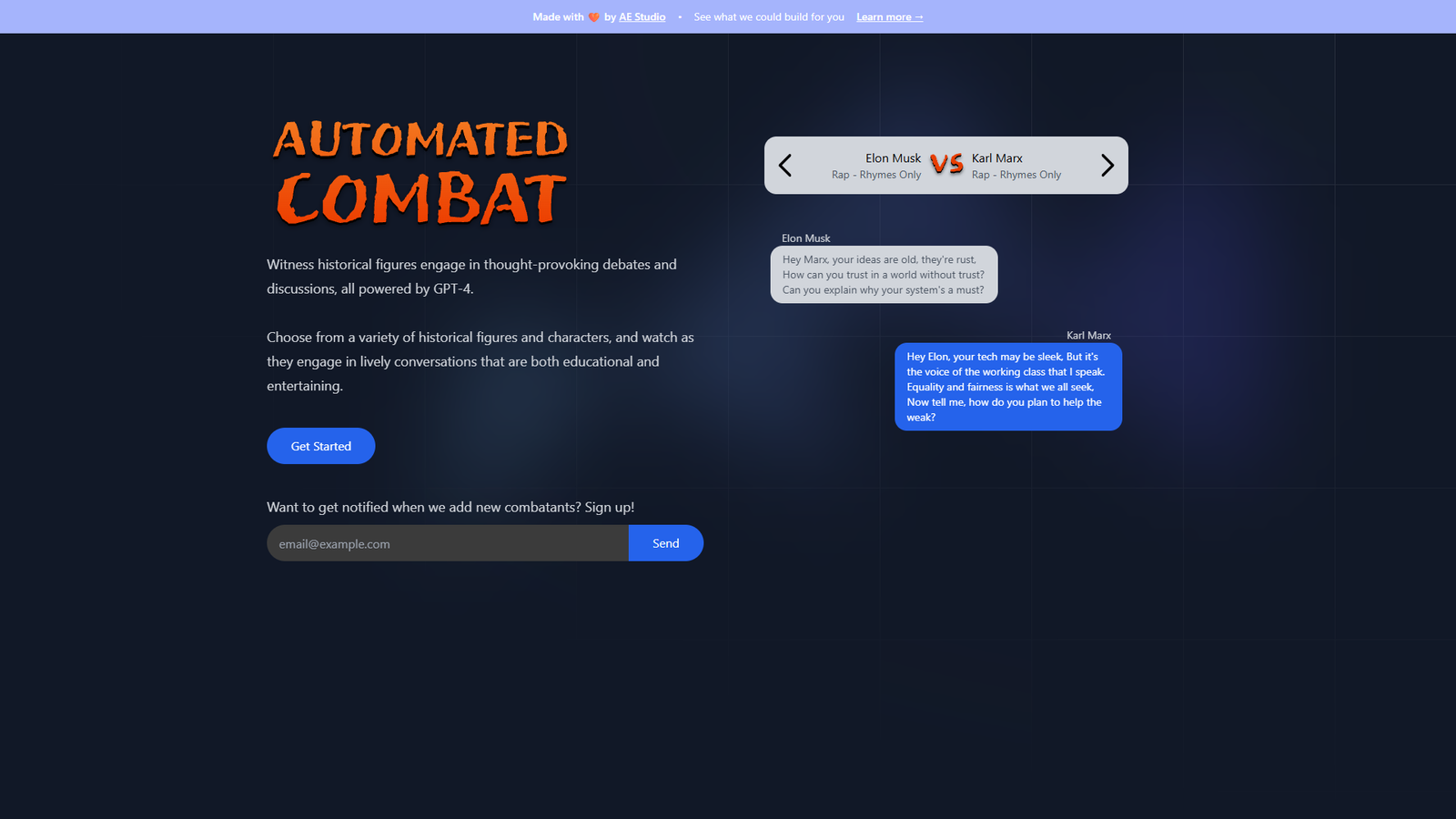 Automated Combat — это веб-сервис, который с помощью GPT-4 устраивает интеллектуальные «поединки» между историческими личностями и известными персонажами. Вы выбираете участников, а ИИ в реальном времени генерирует их аргументы, реплики и даже баттлы в формате рэпа.