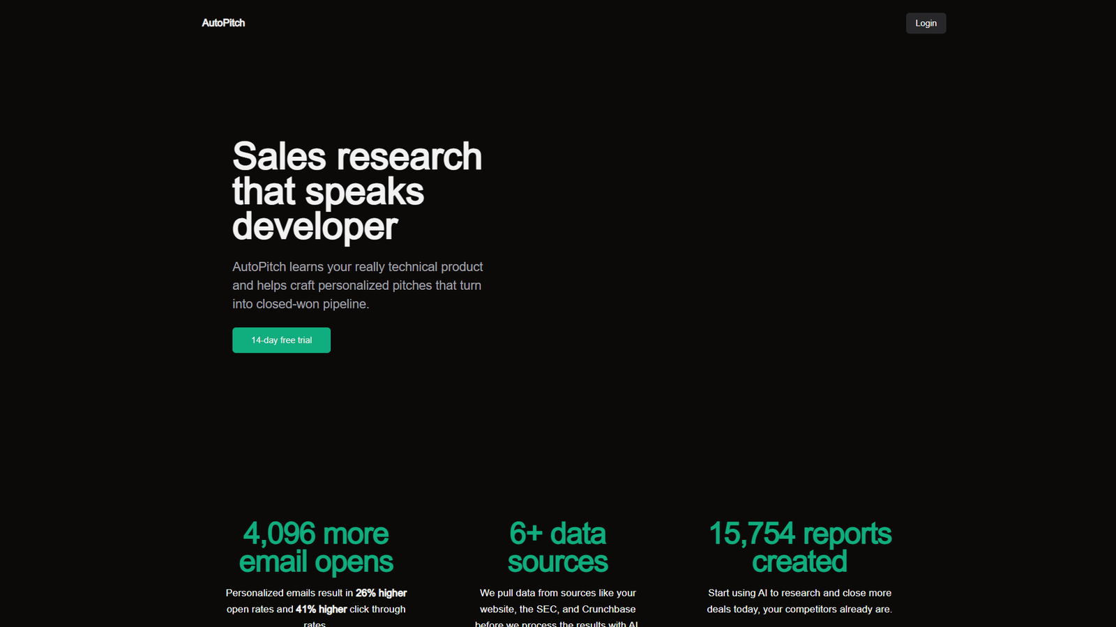 AutoPitch помогает командам продаж исследовать аккаунты, готовить релевантные сообщения и быстрее двигать сделки по воронке. Сервис уже создал тысячи отчётов и писем, которые конвертируются в реальный pipeline и закрытые сделки. Доступен 14‑дневный бесплатный пробный период.