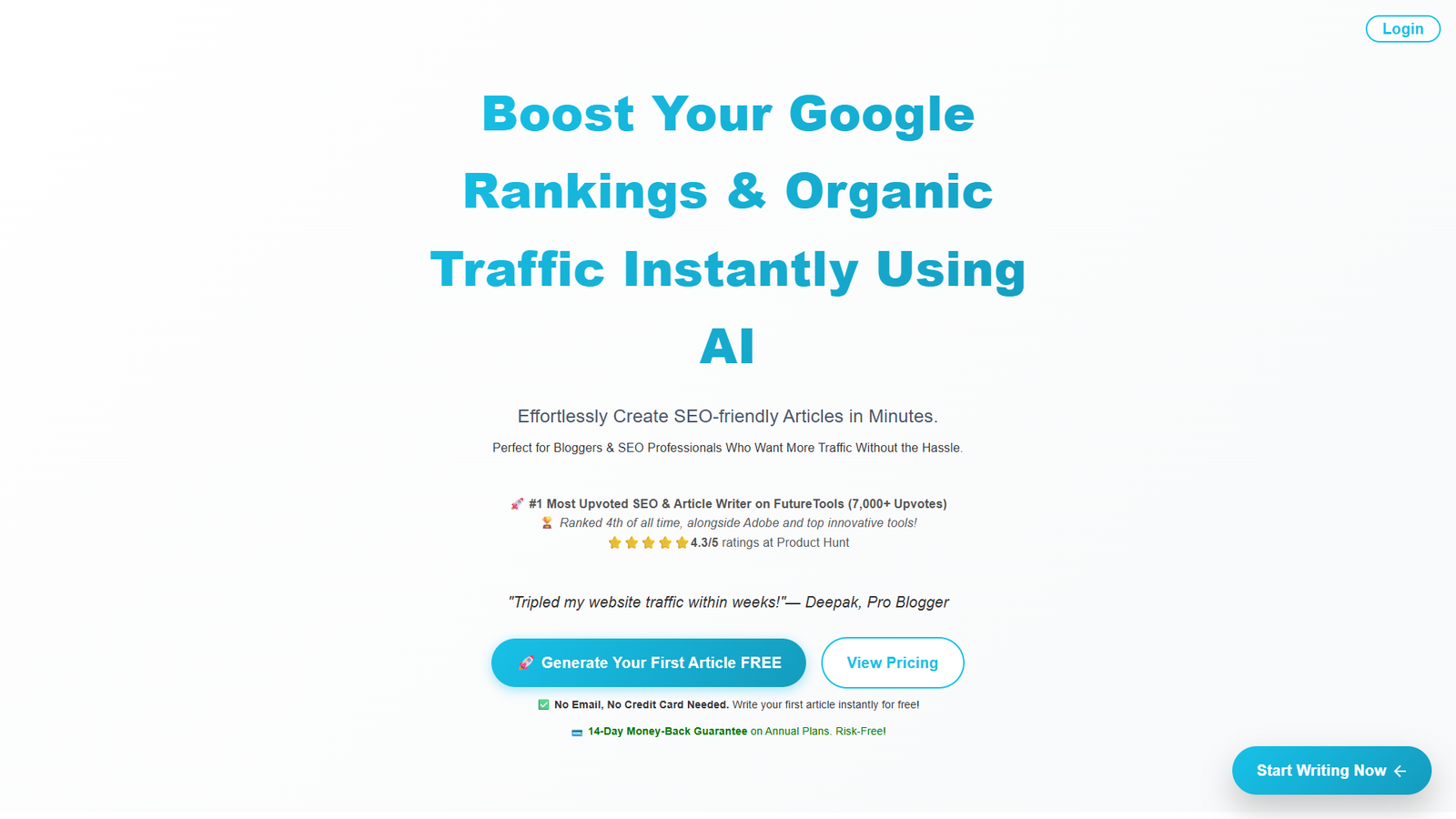 На сайте заявлен бесплатный запуск первой статьи без ввода email и банковской карты — удобно, чтобы проверить качество генерации перед покупкой.