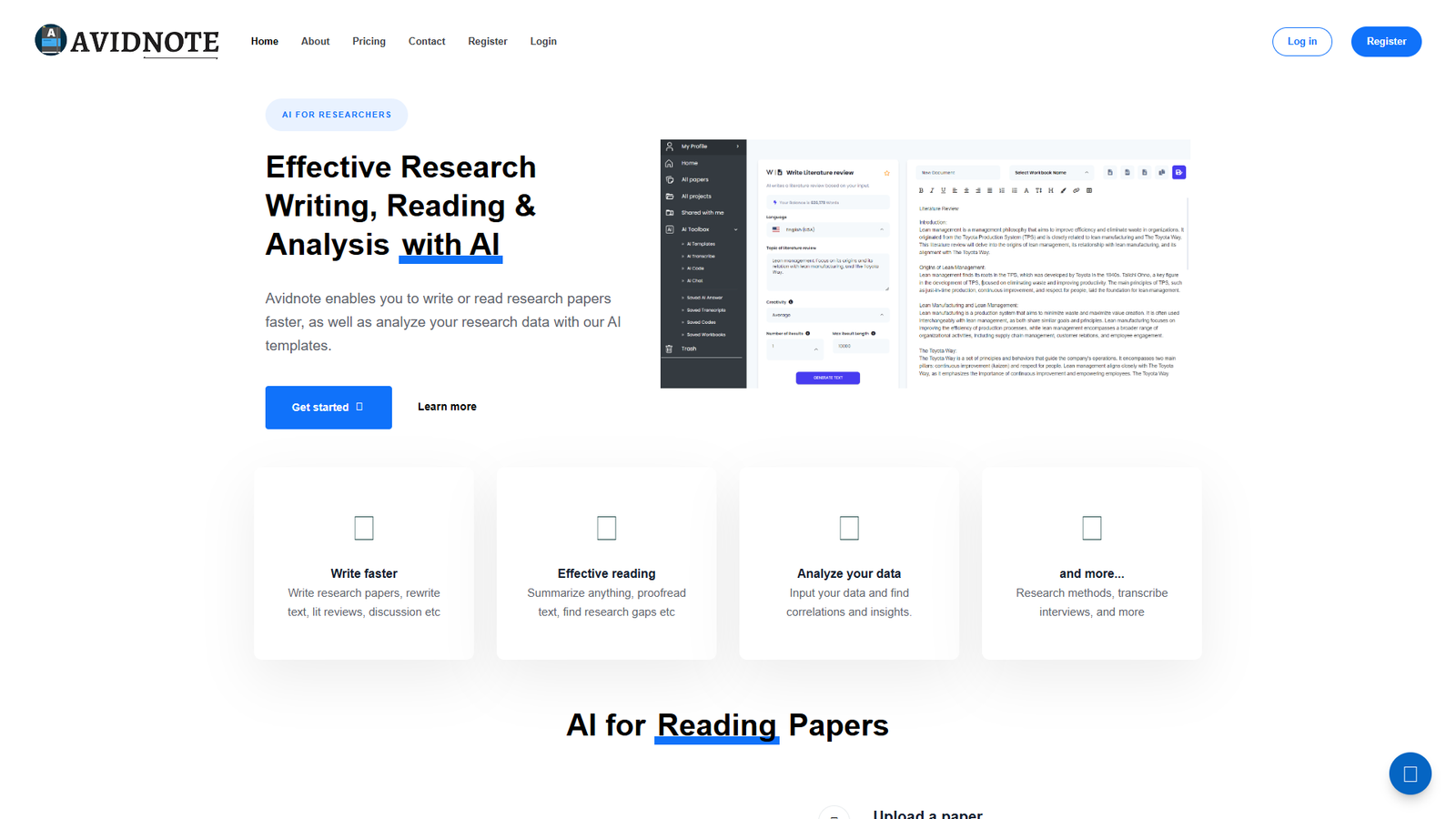 Avidnote — это специализированный ИИ‑ассистент для исследователей, который помогает быстрее писать, читать и анализировать научные работы. Сервис оптимизирует полный цикл исследовательской деятельности: от подготовки рукописи до обработки собранных данных.