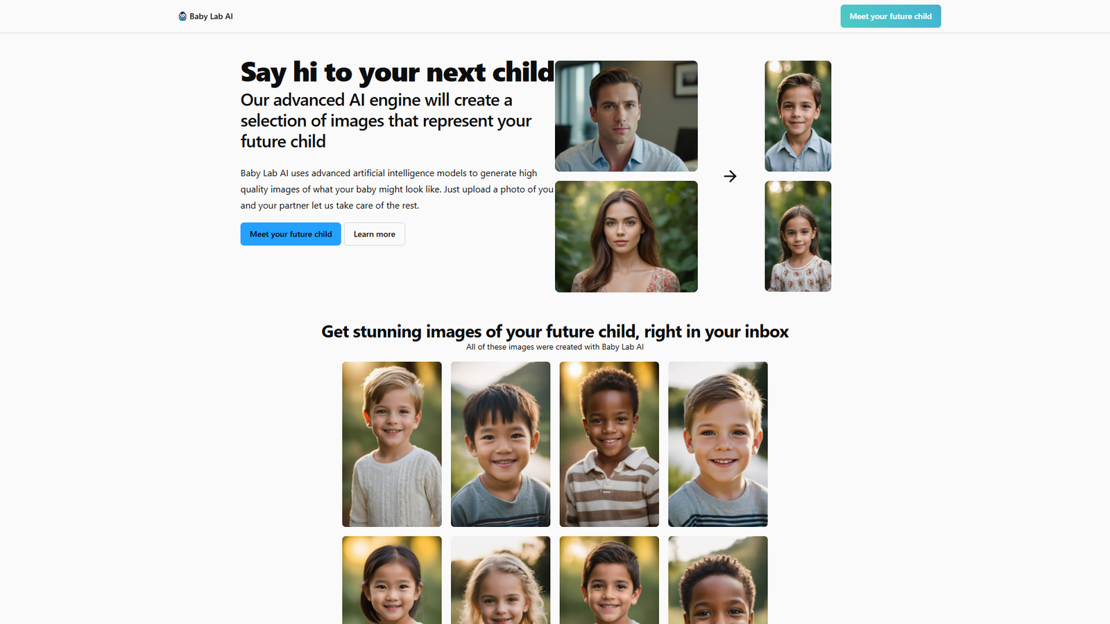 Baby Lab AI — это онлайн‑сервис, который с помощью нейросетей создает фотореалистичные изображения вашего будущего ребенка. Достаточно загрузить фото себя и партнера, а алгоритм сгенерирует несколько вариантов того, как может выглядеть ваш малыш.