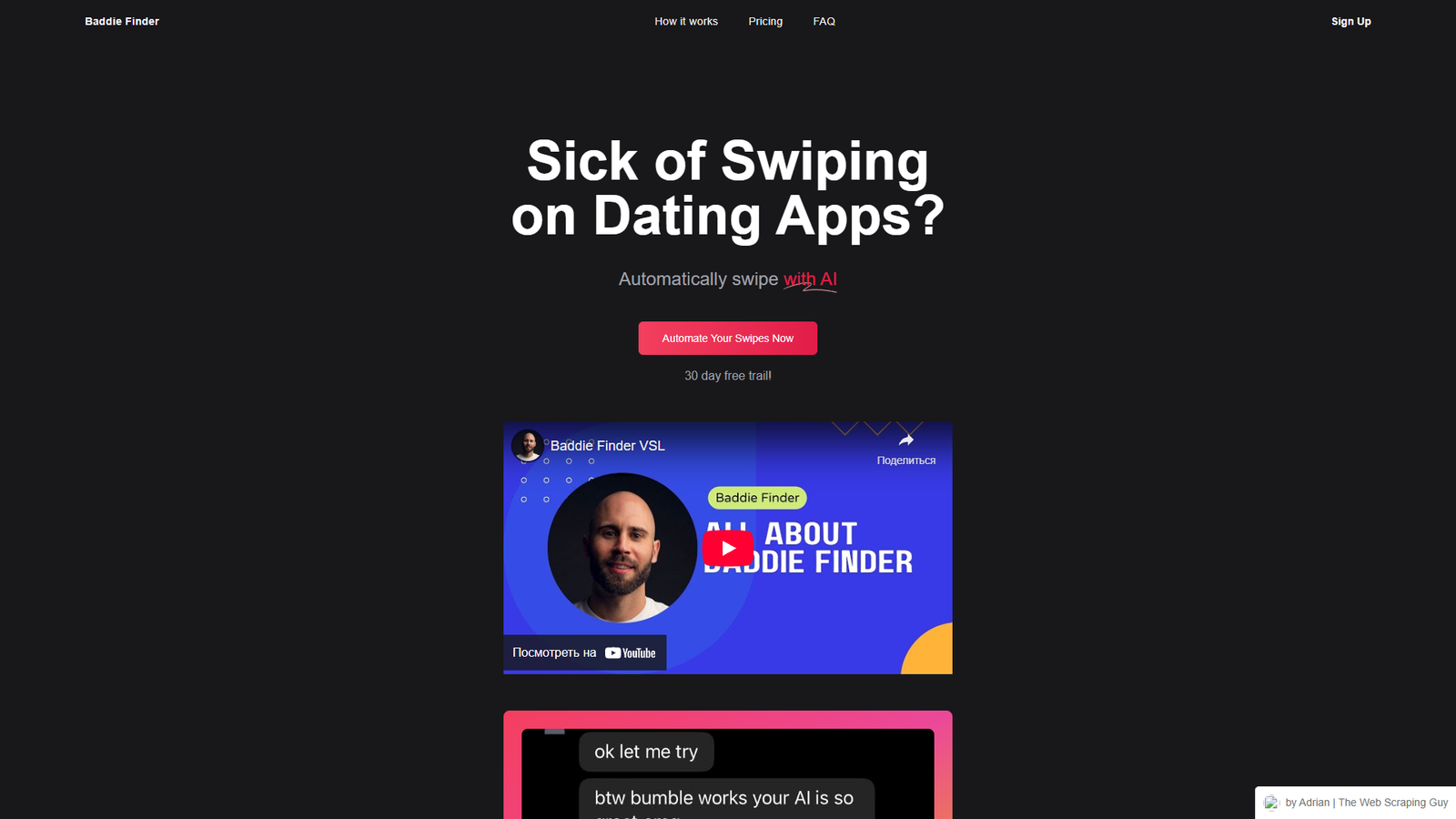 Baddie Finder автоматизирует свайпы в Tinder и Bumble с помощью ИИ, снимая с пользователя рутину бесконечного пролистывания анкет. Алгоритм анализирует фотографии и принимает решение, стоит ли ставить лайк, исходя из заданных предпочтений.