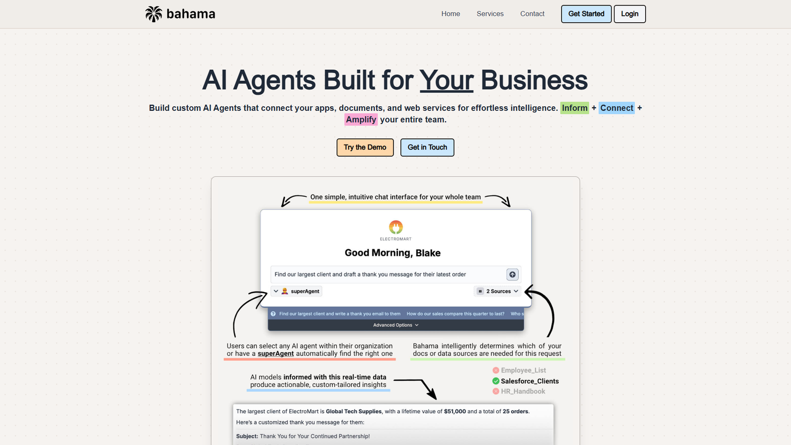 Bahama — это конструктор AI-агентов для бизнеса и команд, которые работают поверх ваших данных и инструментов. Пользователь настраивает агентов под свои процессы, подключает документы, приложения и веб‑сервисы, а затем получает быстрые, обоснованные ответы по реальным данным компании.