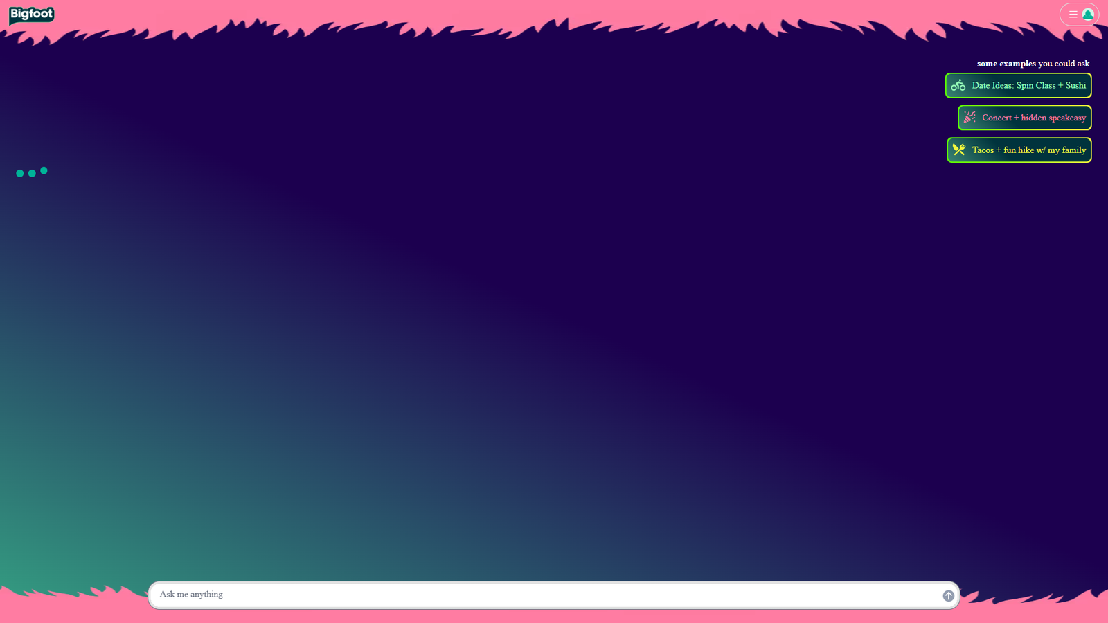 Bigfoot — это AI-гид по городу, который помогает открывать новые впечатления и необычные места рядом с вами. Сервис подбирает идеи для отдыха, свиданий и активностей, исходя из ваших интересов и настроения.