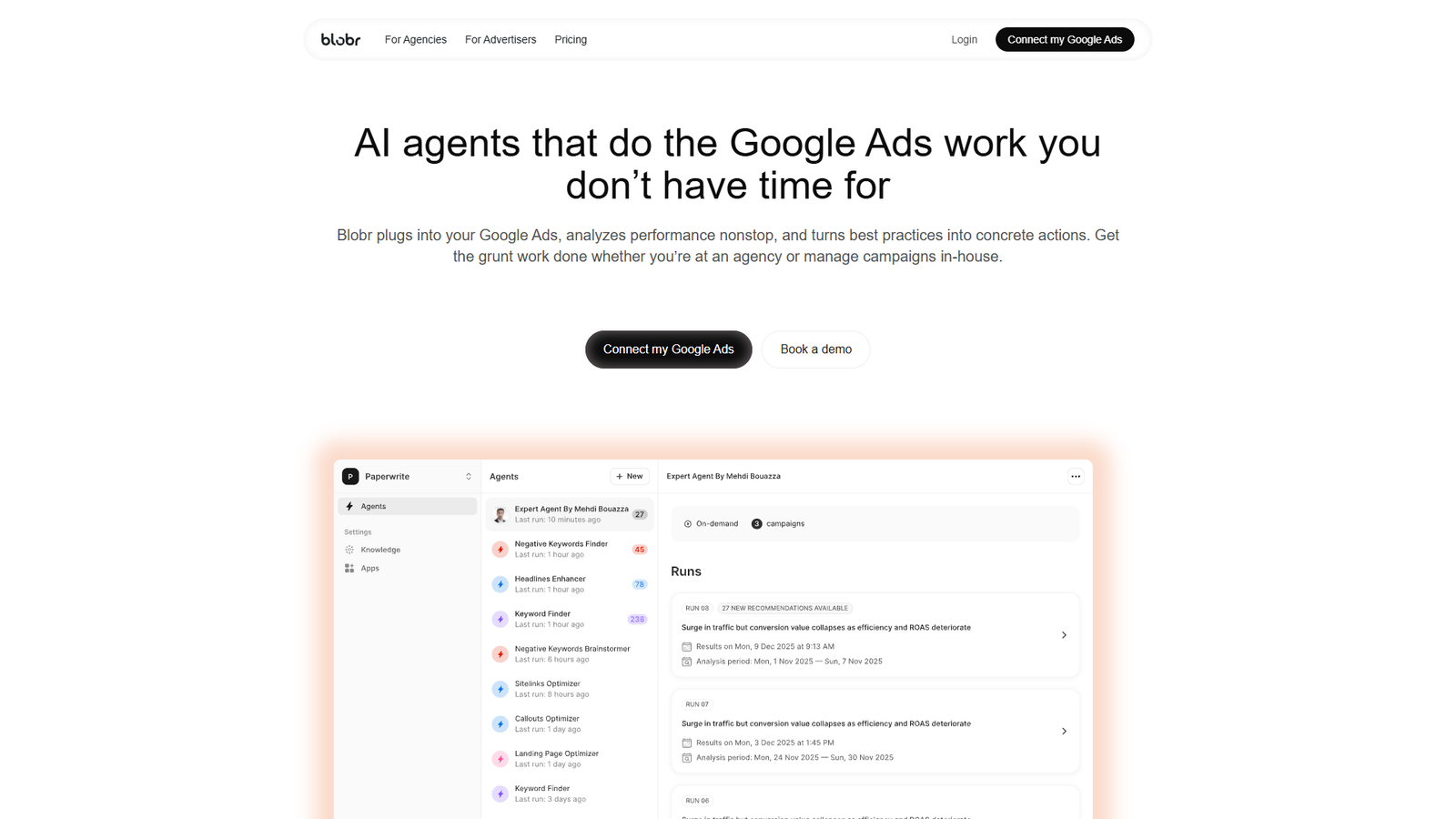 Blobr — это AI-агенты для Google Ads, которые берут на себя рутинную работу по управлению рекламой и помогают запускать кампании на уровне профессионалов. Сервис подключается напрямую к вашему аккаунту Google Ads, непрерывно анализирует показатели и автоматически предлагает или применяет оптимизации.