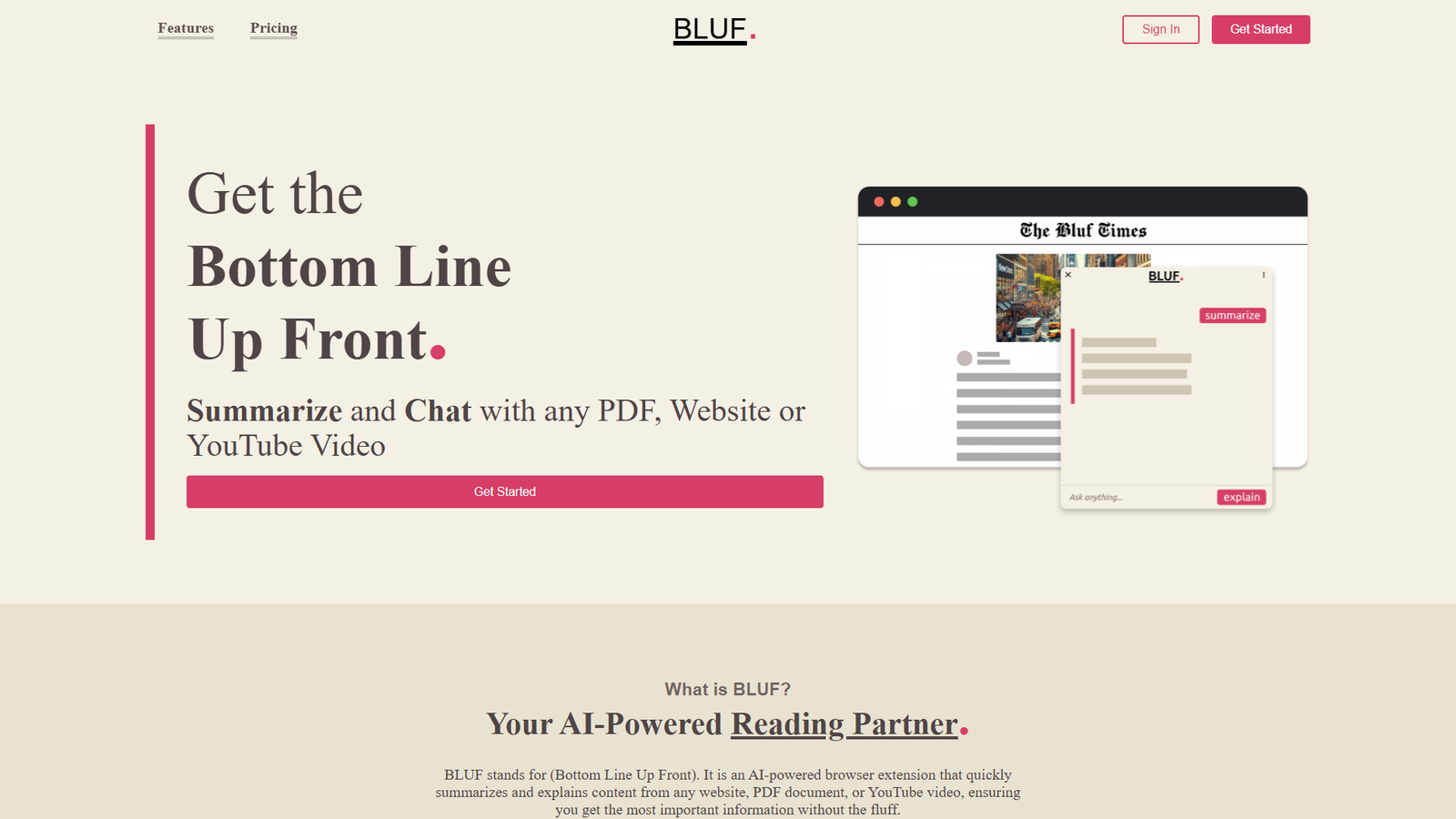BLUF (Bottom Line Up Front) — AI‑расширение для браузера, которое помогает быстро разбираться в контенте без лишней «воды». Сервис умеет суммировать и объяснять материалы с сайтов, PDF-документов и YouTube‑видео, чтобы вы сразу видели главное.