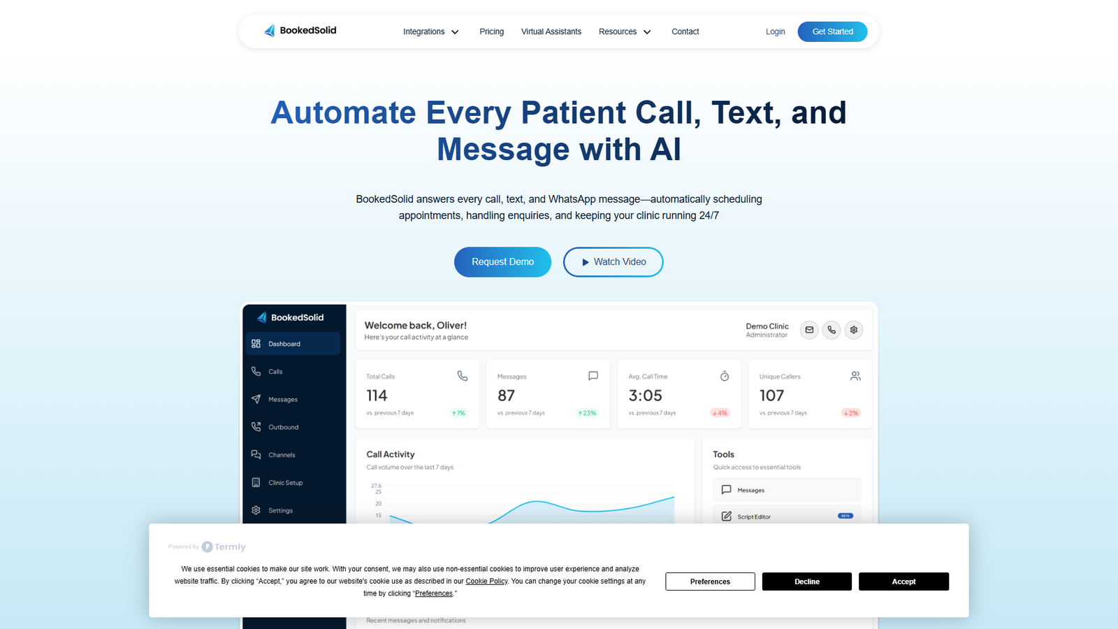 BookedSolid — это AI-ассистент для клиник, который берет на себя входящие звонки, сообщения и переписку. Система подключается к Cliniko или другой медицинской системе управления и работает поверх уже настроенных процессов.