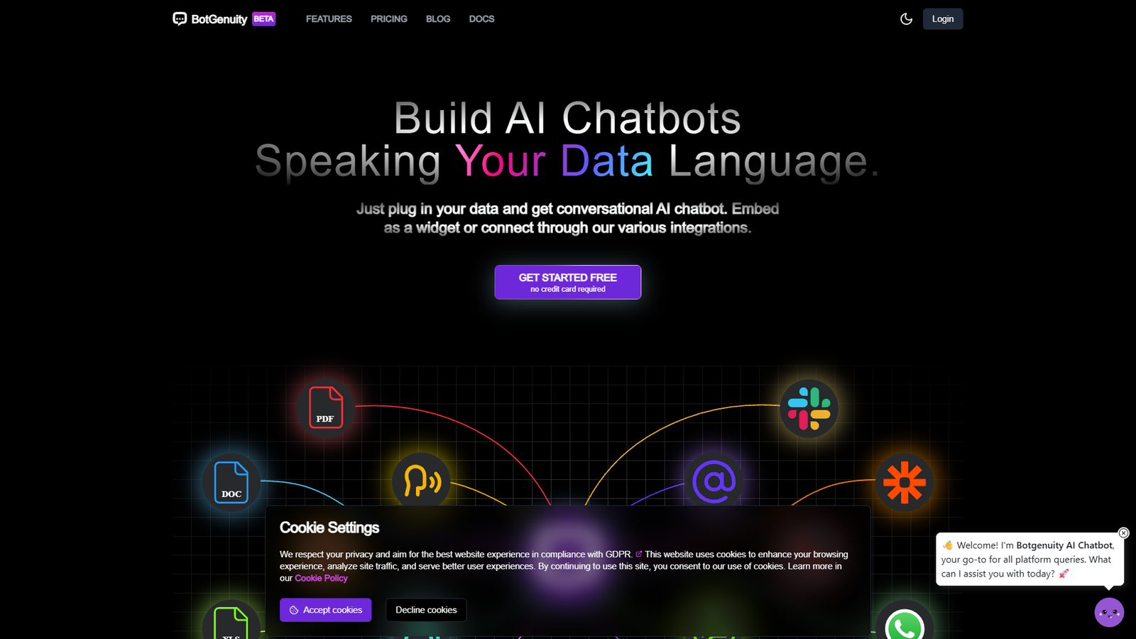 Botgenuity помогает собирать чат-ботов на базе ИИ прямо на ваших данных. Пользователь загружает файлы TXT, PDF, DOC или XLS, настраивает поведение и сразу получает готового помощника для сайта, продукта или внутренней базы знаний.