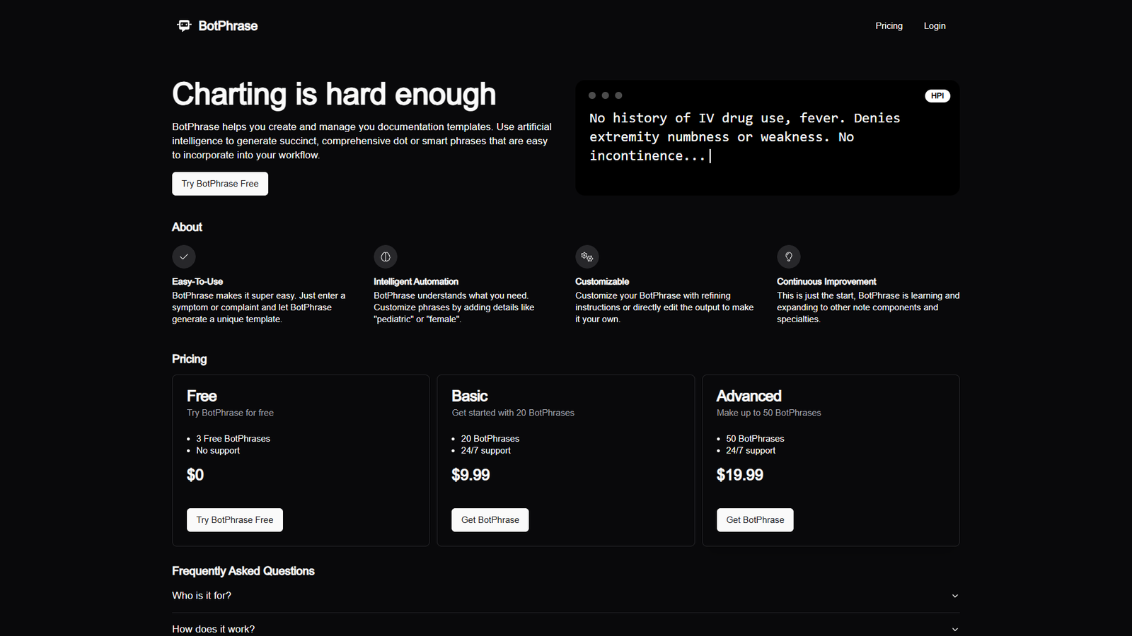 BotPhrase — это специализированный ИИ‑сервис для медицинской документации, который помогает врачам и клиникам быстрее заполнять записи в EHR/EMR‑системах. Он генерирует готовые dot‑фразы и smart‑фразы, которые легко вставляются в привычный рабочий процесс.