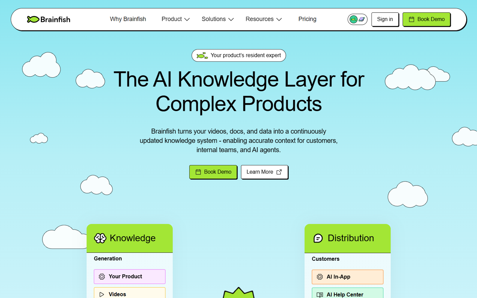 Brainfish — это «AI-слой знаний» для сложных цифровых продуктов, который превращает ваши видео, документацию и внутренние базы в живую, постоянно обновляемую систему знаний. Сервис обучает собственных AI-агентов на реальных материалах продукта и снижает усилия клиентов при обращении в поддержку на любых каналах.