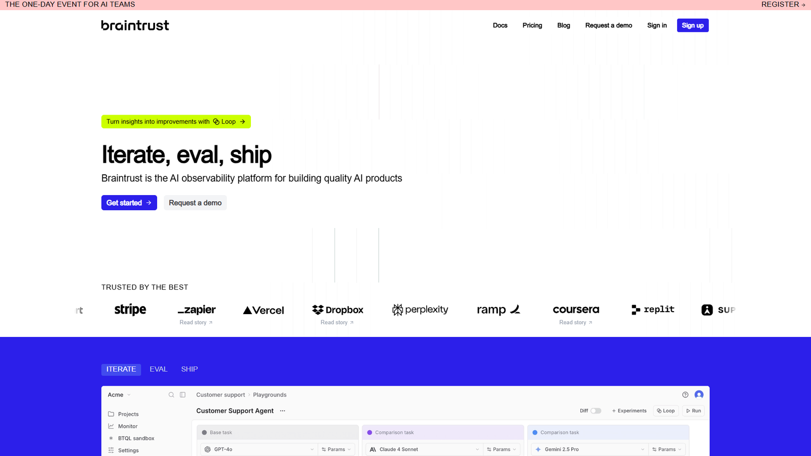Braintrust — платформа наблюдаемости и оценки качества для AI‑продуктов, которая помогает командам безопасно и предсказуемо запускать функции на базе ИИ.