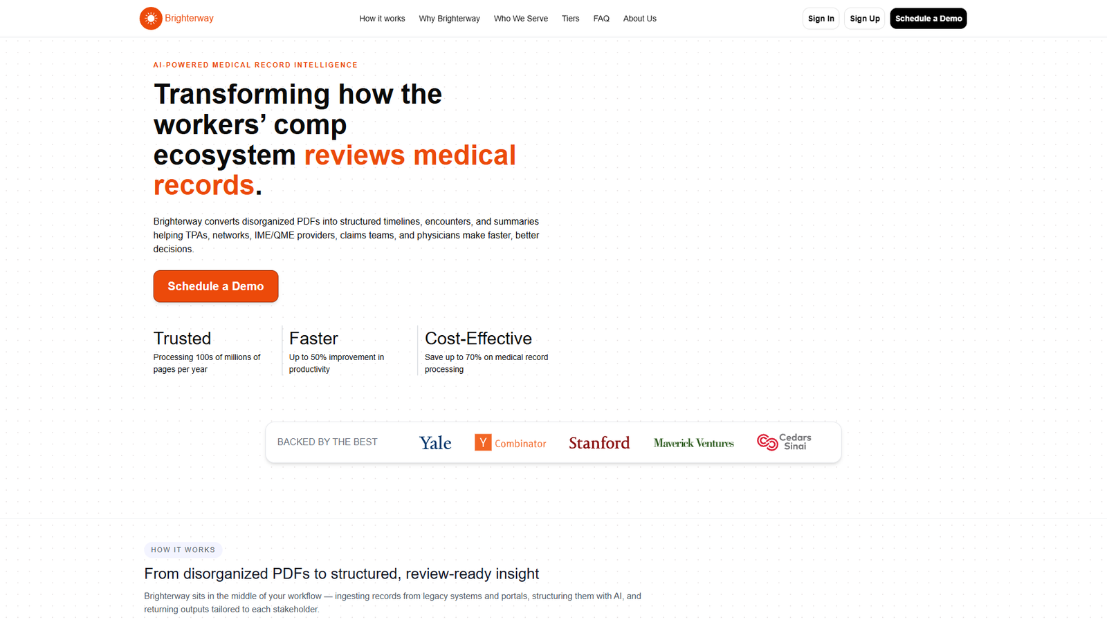 Brighterway — это платформа на базе ИИ для интеллектуальной обработки и суммаризации медицинских записей, ориентированная на рынок workers’ compensation. Сервис автоматически преобразует разрозненные и неструктурированные PDF-документы в удобные для анализа таймлайны, встречи (encounters) и краткие сводки.