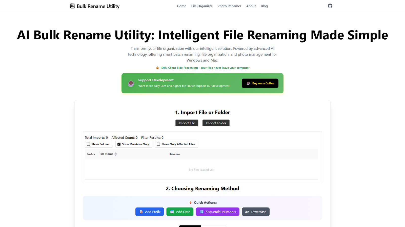 AI Bulk Rename Utility помогает быстро навести порядок в файловом хаосе. Инструмент работает прямо в браузере и не отправляет файлы на сервер, вся обработка выполняется локально на компьютере пользователя.
