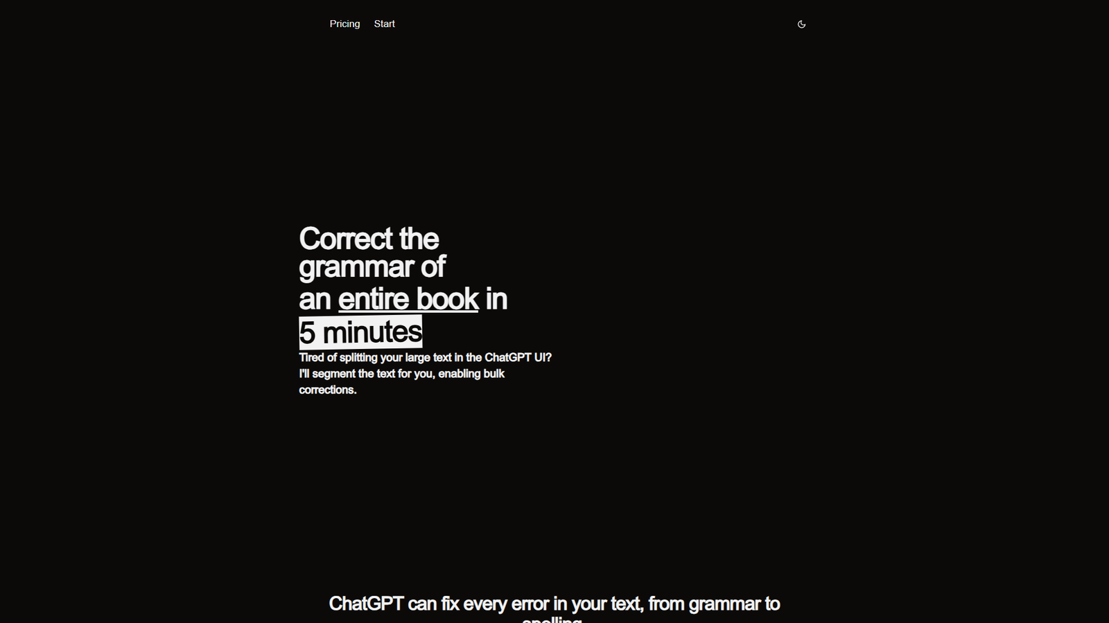 BulkCorrector — онлайн-сервис, который автоматически исправляет грамматику и орфографию в очень больших текстах, вплоть до целой книги, всего за несколько минут. Он решает главную проблему работы с ChatGPT и другими чат-интерфейсами: ограничение по длине текста и необходимость вручную делить документ на части.