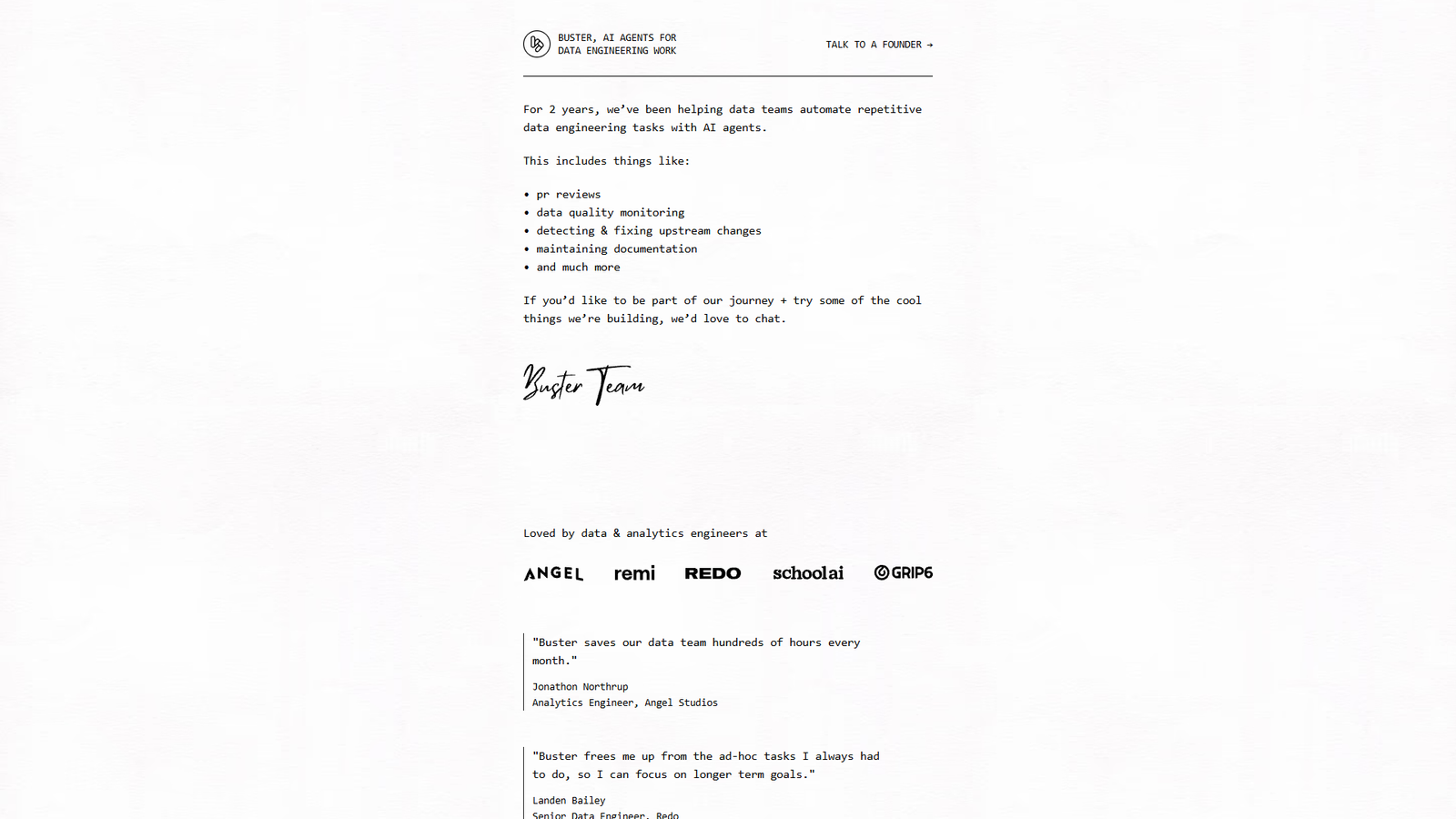 Buster — это платформа AI-агентов, созданная специально для задач data и analytics engineering. Сервис помогает командам данных автоматизировать рутинные процессы вокруг dbt-проектов и инфраструктуры данных.