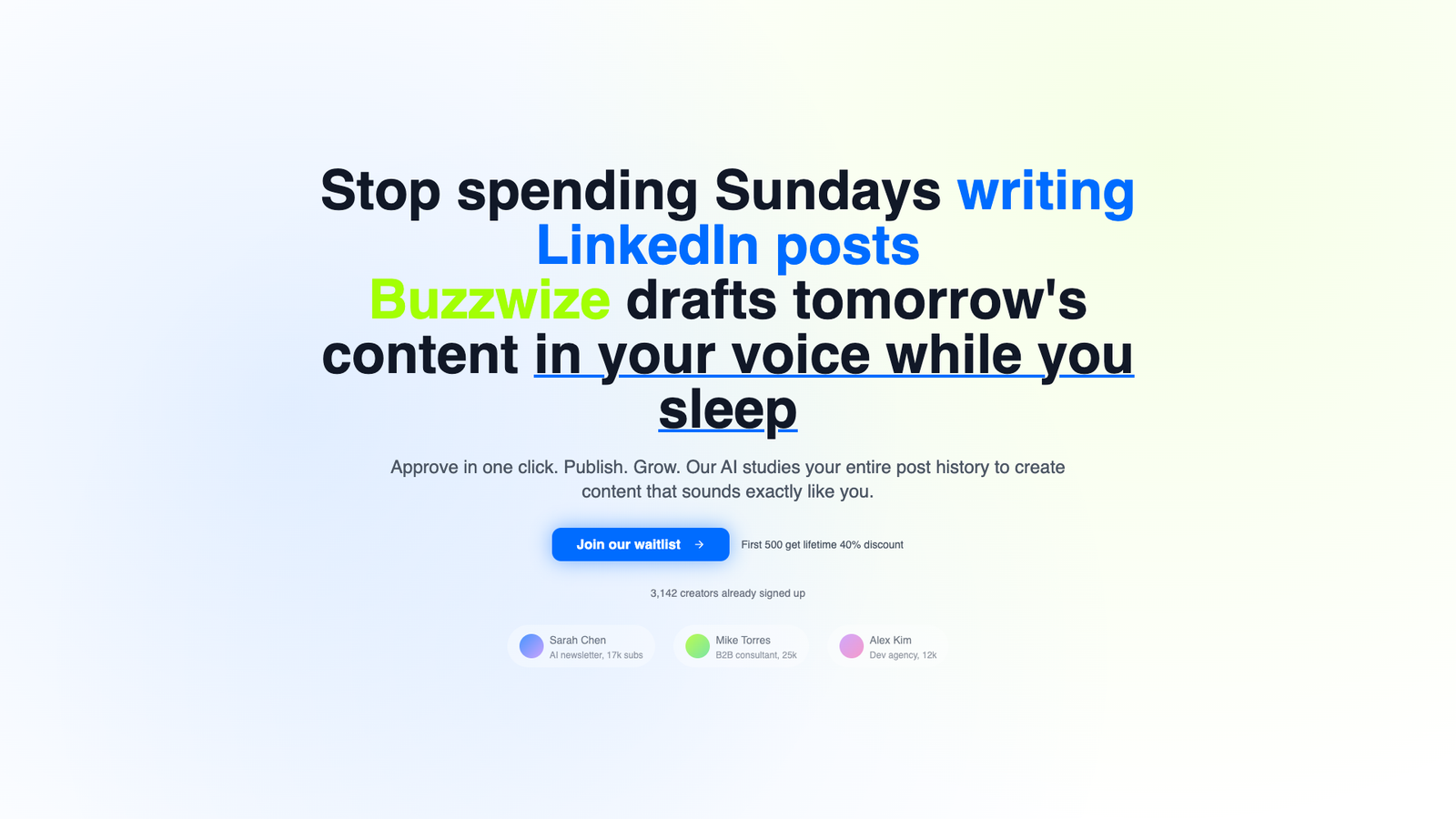 Buzzwize ориентирован на авторов, консультантов, фаундеров и экспертов, которые растят личный бренд через LinkedIn. Инструмент снижает нагрузку на выходных и освобождает время для работы и общения с клиентами, не жертвуя регулярностью публикаций.