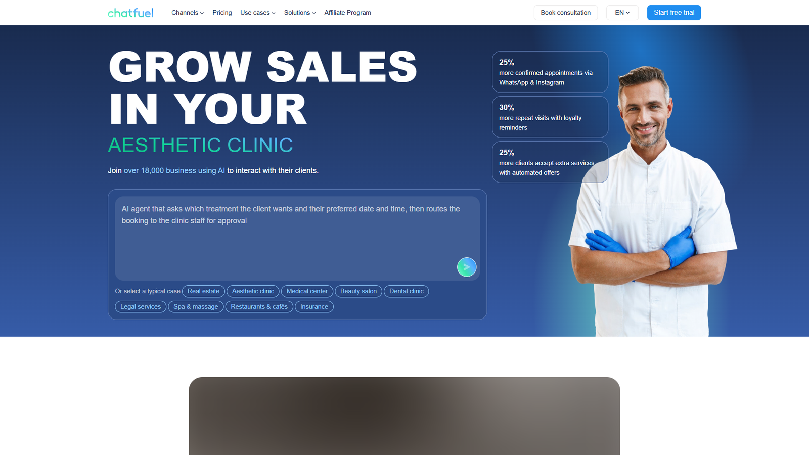 Сервис особенно полезен для эстетических клиник, медицинских центров, салонов красоты, стоматологий, спа, ресторанов и агентств недвижимости. Chatfuel помогает увеличивать количество подтверждённых записей, повторных визитов и допродаж за счёт автоматических напоминаний, персонализированных предложений и работы 24/7.
